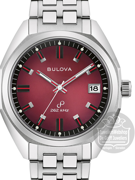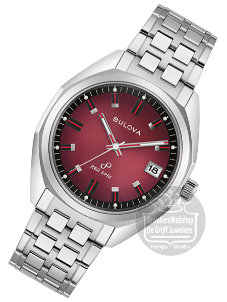 Het Bulova 96B401 horloge uit de Precisionist collectie bijzonder accuraat quartz uurwerk. Aangedreven door het Precisionist-uurwerk met e-vormig kwartskristal en langzaam voortschrijdende secondewijzer. De oscillatiefrequentie van 262 Herz maakt een ongeëvenaard hoge precisie mogelijk. Dit horloge heeft een edelstalen kast, een bordeaux rode wijzerplaat met zwarte accenten, een edelstalen schakelband en krasvast saffierglas.