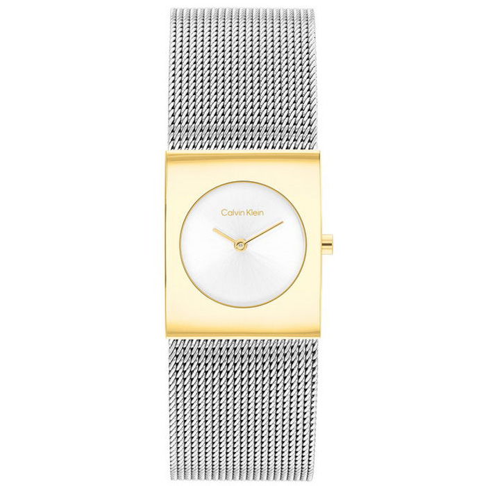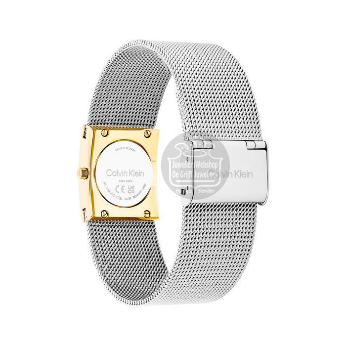 Het Calvin Klein Pulse CK25100139 horloge is een prachtig ingetogen horloge voor dames. Het horloge heeft een zilverkleurige edelstalen milanese band.Het CK CK25100139 horloge heeft een rechthoekige goudkleurige edelstalen kast en een zilverkleurige sunray wijzerplaat. De wijzerplaat van dit horloge is voorzien van de naam Calvin Klein en goudkleurige wijzers. De breedte van de horlogekast is ca. 21 mm.De Calvin Klein CK25100139 heeft een quartz uurwerk, mineraal glas en is 3ATM waterdicht.
