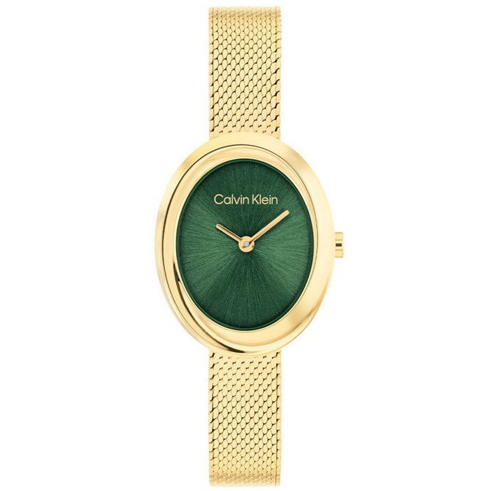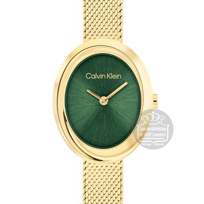 Het Calvin Klein Twisted Bezel CK25100152 horloge is een prachtig ingetogen horloge voor dames. Het horloge heeft een goudkleurig edelstalen milanese band, een goudkleurige ovaalvormige edelstalen kast, en een groene wijzerplaat. De wijzerplaat van dit horloge is voorzien van de naam Calvin Klein en goudkleurig wijzers. De doorsnede van de horlogekast is ca. 24 mm.De Calvin Klein CK25100152 heeft een quartz uurwerk, mineraal glas en is 3ATM waterdicht.