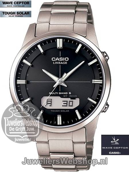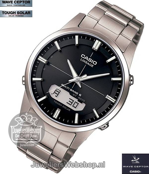 - Casio WAVE CEPTOR Titanium- Digitaal/Analoog- Zwarte wijzerplaat- Saffier glas- Titanium kast- Titanium band- Radio Controlled- Vele funkties!