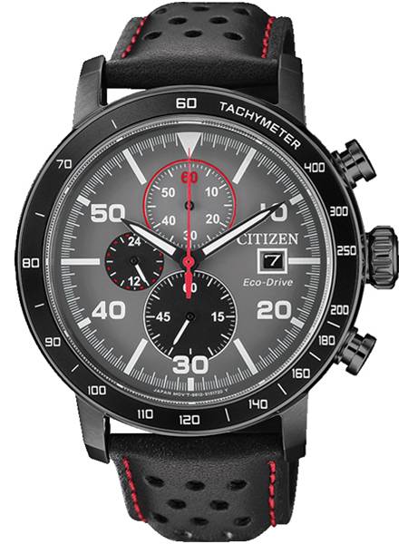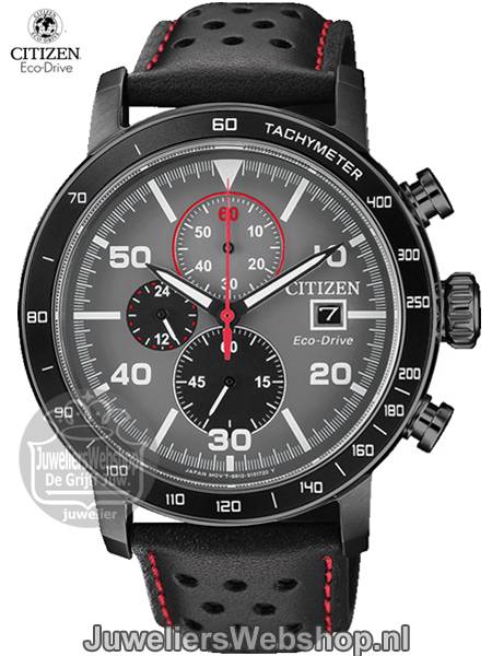 Sportief Citizen herenhorloge met Eco-Drive. Dit horloge heeft een zwart vergulde edelstalen kast met zwarte Tachymeter, een zwart lederen band met rode stiksels en een grijze wijzerplaat met witte, zwarte en rode accenten. Het Citizen Chronograaf horloge is voorzien van mineraal glas en is 10 atm waterdicht.