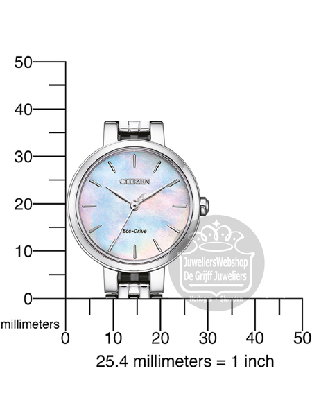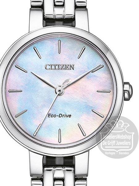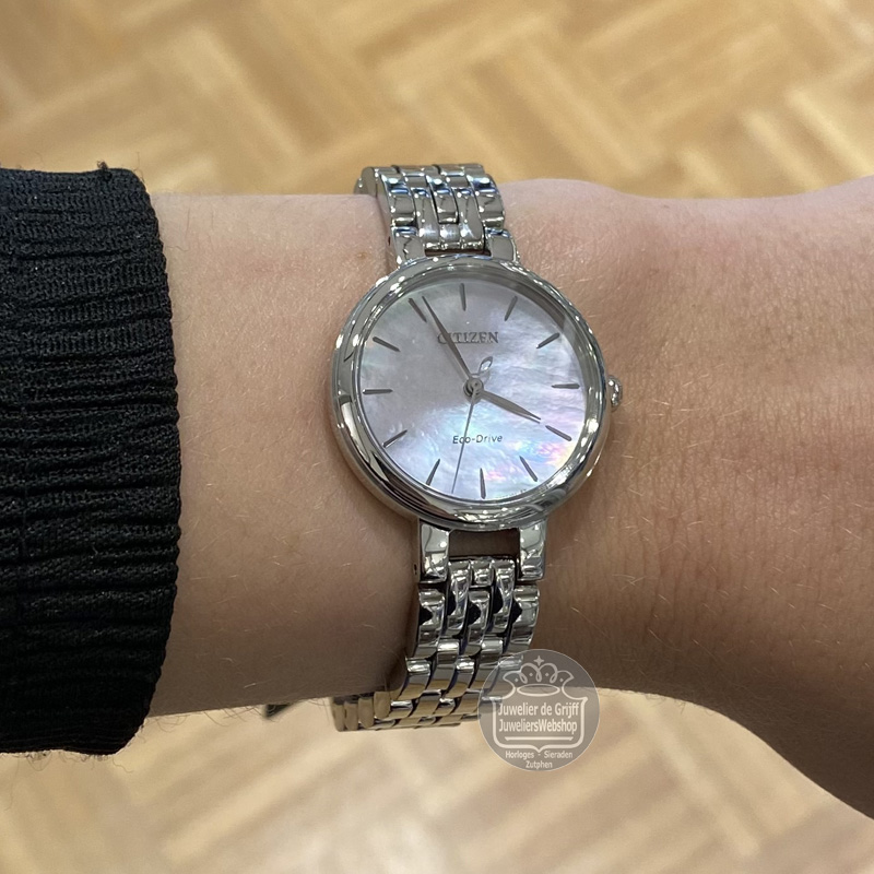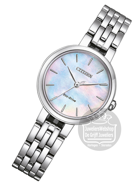 Citizen EM0990-81Y dameshorloge. Een fantastische mooi en subtiel horloge met een edelstalen kast, een stalen band en een parelmoer wijzerplaat. Dit Citizen horloge is voorzien van Eco-drive techniek, waardoor u nooit meer een nieuwe batterij hoeft in te zetten. De accu in het horloge wordt opgeladen door lichtinval op de wijzerplaat. Het horloge heeft krasvast saffier glas en is waterdicht tot 5 atm.