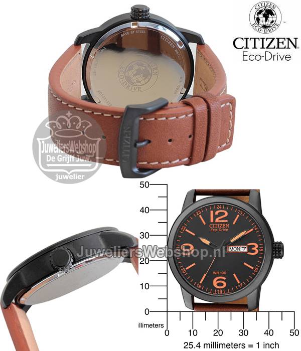 Citizen herenhorloge met een Military Pilot look.De BM8476-07EE Pilot van Citizen heeft een IP zwart gecoate edelstalenkast, een zwarte wijzerplaat, een bruin lederen horlogeband, gehard mineraal glas en is 10 ATM waterdicht.De Pilot BM8476-07EE van Citizen maakt gebruik van de Eco Drive techniek en heeft dusgeen batterijwissel nodig!
