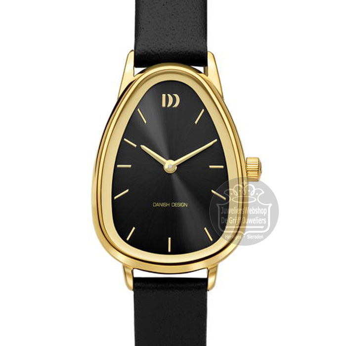 Het IV15Q1306 dames horloge uit de Fjordsten collectie van Danish Design heeft een elegante en moderne uitstraling. Het dameshorloge heeft een zwarte leren horlogeband en een goudkleurige organisch gevormde ovale stalen kast. Het horloge heeft een zwarte wijzerplaat met goudkleurige accenten en het Danish Design logo, mineraal glas en is 3 atm waterdicht.