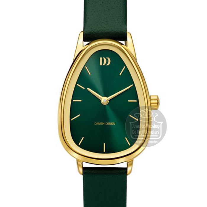 Het IV32Q1306 dames horloge uit de Fjordsten collectie van Danish Design heeft een elegante en moderne uitstraling. Het dameshorloge heeft een groene leren horlogeband en een goudkleurige organisch gevormde ovale stalen kast. Het horloge heeft een groene glanzende wijzerplaat met goudkleurige accenten en het Danish Design logo, mineraal glas en is 3 atm waterdicht.