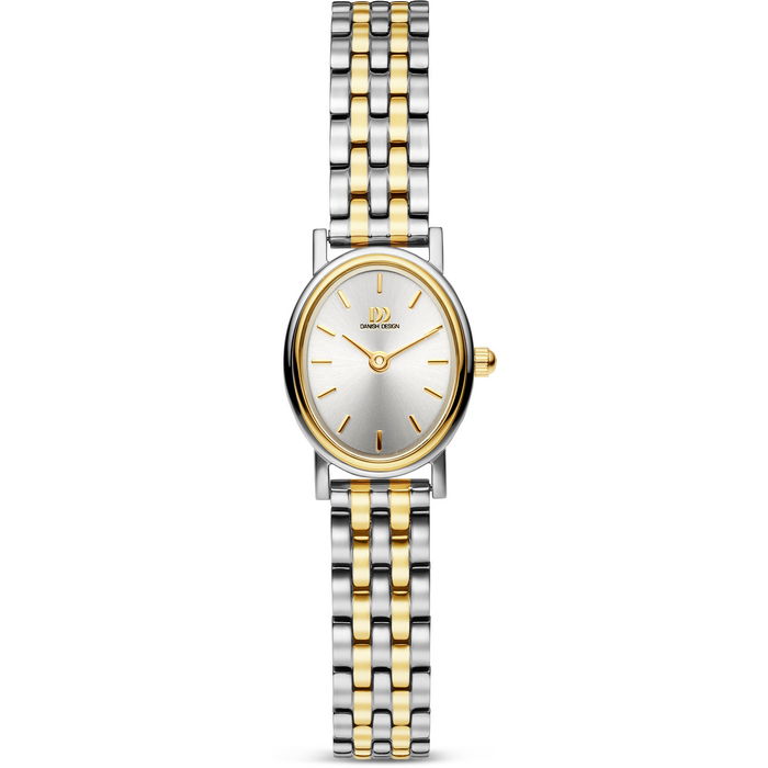 Het IV95Q1310 Danish Design trendy dames horloge uit de nieuwe najaarscollectie 2025 heeft een elegante uitstraling. Het dameshorloge heeft een bicolor edelstalen horlogeband en een ovale zilverkleurige edelstalen kast met goudkleurig randje. Het horloge heeft een zilverkleurige wijzerplaat met goudkleurige accenten, mineraal glas en is 3 atm waterdicht.