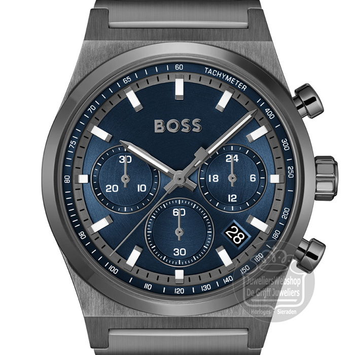 Het Hugo Boss Candor Chrono horloge is een sportief en chique heren horloge. Het horloge heeft een edelstalen horlogekast en schakelband in een prachtige antracieten/ zwarte kleur. Het horloge heeft een blauwe wijzerplaat met antracieten accenten, een datum- en 24uurs aanduiding en een stopwatch. Als extra functie beschikt de Candor Chrono ook nog over een tachymeter.Het horloge is voorzien van mineraal glas, is waterdicht tot 5 atm en wordt geleverd met een originele Hugo Boss watch box.