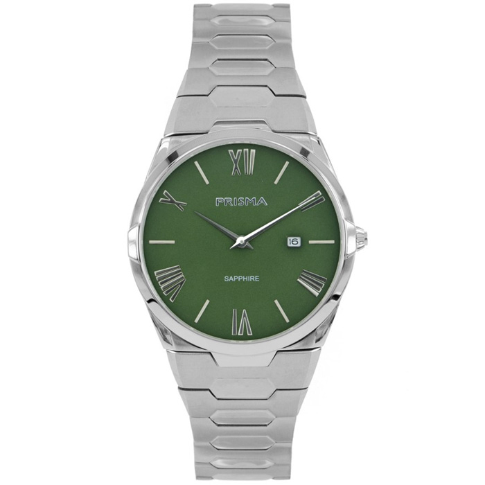 Het Prisma P1338 Stainless Steel horloge uit de Slimline collectie heeft een edelstalen kast, een edelstalen band en een groene wijzerplaat met zilverkleurige accenten. Het horloge heeft een datum aanduiding, saffier glas en is tot 3 ATM waterdicht.