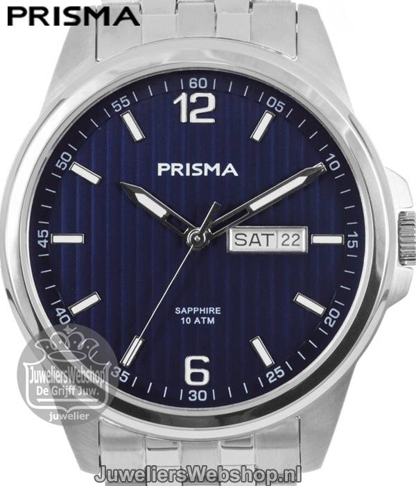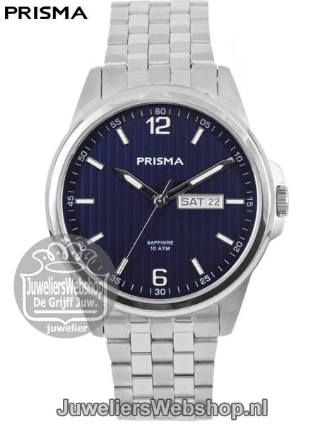 Het Prisma P1664 Pattern Steel horloge heeft een edelstalen kast, een edelstalen band en een blauw wijzerplaat met zilverkleurige accenten. Het horloge heeft een dag en datum aanduiding, saffier glas en is tot 10 ATM waterdicht (spatwaterdicht).