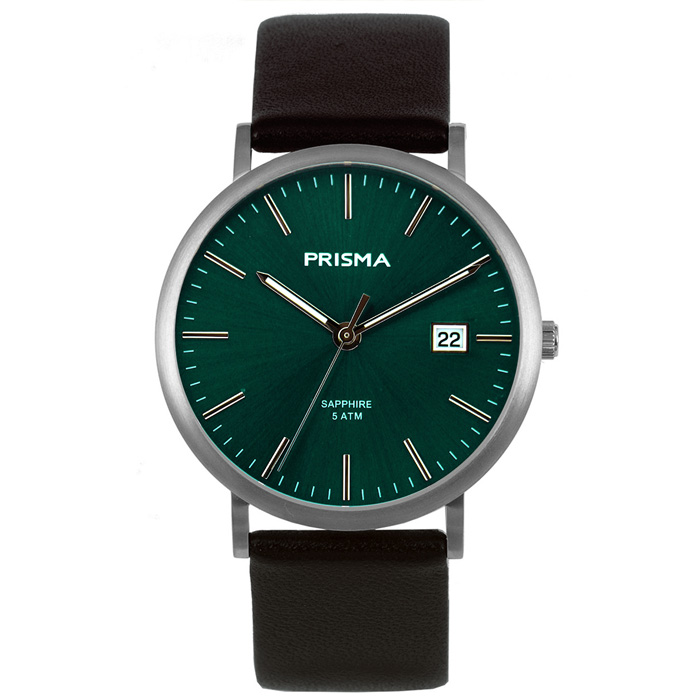 Het Prisma P1673 Titanium horloge heeft een titanium kast, een zwarte leren band en een groene wijzerplaat met zilverkleurige accenten. Het horloge heeft een datumaanduiding, saffier glas en is tot 5 ATM waterdicht.