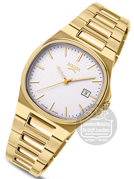 Het Boccia 3348-02 Titanium horloge is een modern dameshorloge. Het horloge heeft een goudkleurige titanium kast, een deels glanzende en deels matte goudkleurige titanium band en een sportieve geblokte wijzerplaat met goudkleurige accenten. Het Boccia horloge heeft krasvast saffierglas en is 5 atm waterdicht.