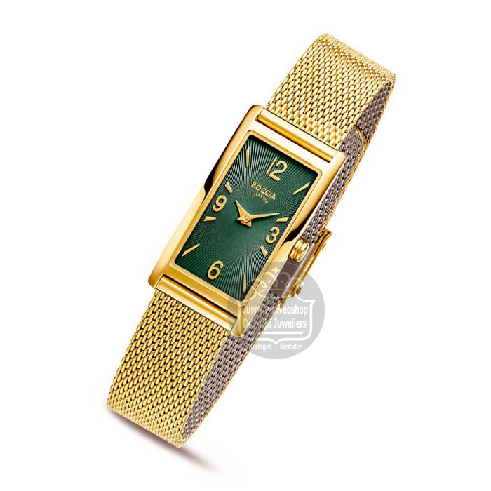Het Boccia 3366-03 Titanium horloge is een prachtig elegant dameshorloge. Het horloge heeft een glanzende goudkleurige titanium kast, een goudkleurige stalen milanese band en een sierlijke groene wijzerplaat met goudkleurige accenten. Het Boccia horloge heeft mineraalglas en is 3 atm waterdicht.
