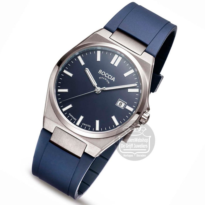Het Boccia 3667-01 Titanium heren horloge heeft een titanium kast en blauwe siliconen band en een blauwe wijzerplaat met zilverkleurige accenten en een datumaanduiding. Het Boccia horloge heeft krasvast saffierglas en is 5 atm waterdicht.