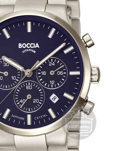 Het Boccia 3746-02 Titanium horloge is een sportief herenhorloge. Het horloge heeft een titanium kast en band en een donkerblauwe wijzerplaat. Het Boccia horloge heeft een chronograaf functie, datum aanduiding, krasvast saffierglas en is 5 atm waterdicht.