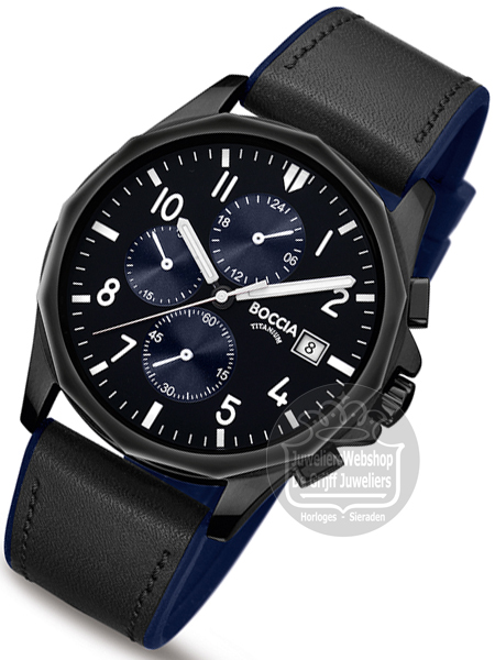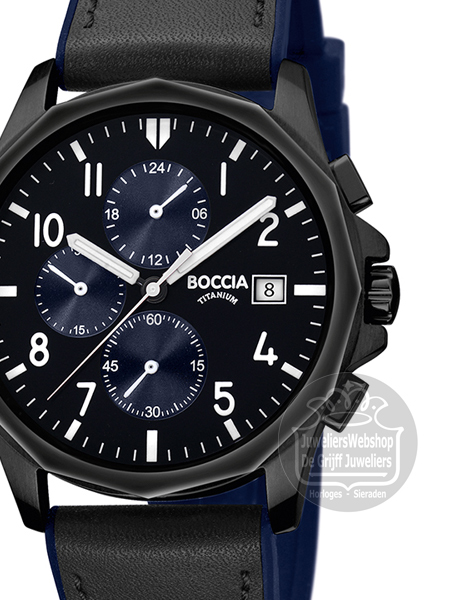 Het Boccia 3747-03 Titanium horloge is een sportief herenhorloge. Het horloge heeft een zwarte titanium kast, zwarte leren band met blauwe siliconen binnenkant en een zwarte wijzerplaat. Het Boccia horloge heeft een chronograaf functie, datum aanduiding en is 5 atm waterdicht.