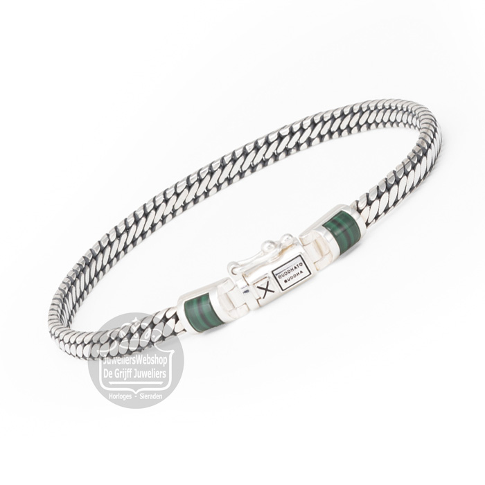 Deze zilveren armband van Buddha to Buddha uit de Ben serie, is een handgemaakte echt zilveren armband van glad gepolijste inelkaar gevlochten kleine schakels. De Ben Mini Malachite armband is smaller dan de Ben Junior, Ben, de Ben Medium en de Ben XL armband. Doordat de Buddha armband tussen de schakels geoxideerd is, geeft dit een heel speciaal robuust effect. De armband is voorzien van gestreepte groene malachiet en een stijlvolle sluiting met het logo van Buddha to Buddha. Voor extra veiligheid tegen verlies is de sluiting uitgevoerd met een extra veiligheid.