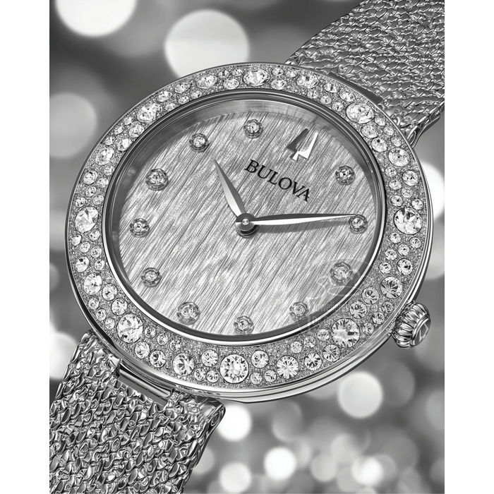 Het Bulova 96L329 dameshorloge combineert verfijnde elegantie met subtiele schittering. De zilverkleurige kast van 32 mm is omlijst met maar liefst 103 zorgvuldig geplaatste Oostenrijkse kristallen, terwijl de fijne mesh-armband in zilverkleur schittert en zich comfortabel om de pols slaat. De textuur van de wijzerplaat voegt diepte toe, ondersteund door elf kristallen als uurmarkeringen en slanke zilverkleurige wijzers. Achter dit delicate design schuilt een betrouwbaar quartz-uurwerk. Het anti-reflecterend saffierglas beschermt tegen krassen, en de waterdichtheid tot 30 meter maakt hem geschikt voor dagelijks gebruik. De Bulova 96L329 is daarmee een sierlijke balans tussen glamour en functionaliteit.