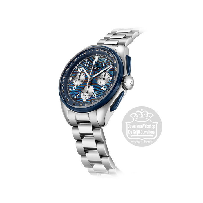 De Bulova 98A329 Lunar Pilot Timascus is een gelimiteerde jubileumeditie die werd uitgebracht ter ere van 150 jaar Bulova en is ontworpen in samenwerking met de Braziliaanse kunstenaar Thiago Rosinhole. De wijzerplaat is vervaardigd uit Timascus, een speciaal bewerkt titanium met unieke blauwe patronen, waardoor elk horloge een exclusief karakter krijgt. De 43,5 mm roestvrijstalen kast met blauwe chronograafknoppen, een kroon met het Bulova-logo en een massieve schakelband met vlindersluiting geven het horloge een krachtige uitstraling.