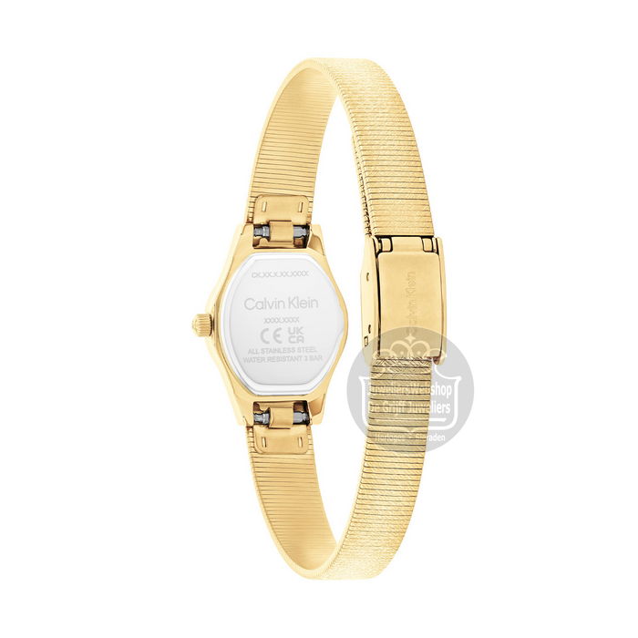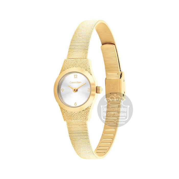 Het CK CK25100193 horloge heeft een ronde goudkleurige edelstalen kast en een zilverkleurige wijzerplaat. De wijzerplaat van dit horloge is voorzien van de naam Calvin Klein en goudkleurige wijzers. De breedte van de horlogekast is ca. 18 mm.