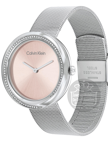 Het CK CK25200149 horloge heeft een edelstalen kast met schitterende accenten en een zachtroze wijzerplaat. De wijzerplaat van dit horloge is voorzien van de naam Calvin Klein en zilverkleurige wijzers. De doorsnede van de horlogekast is ca. 34 mm.