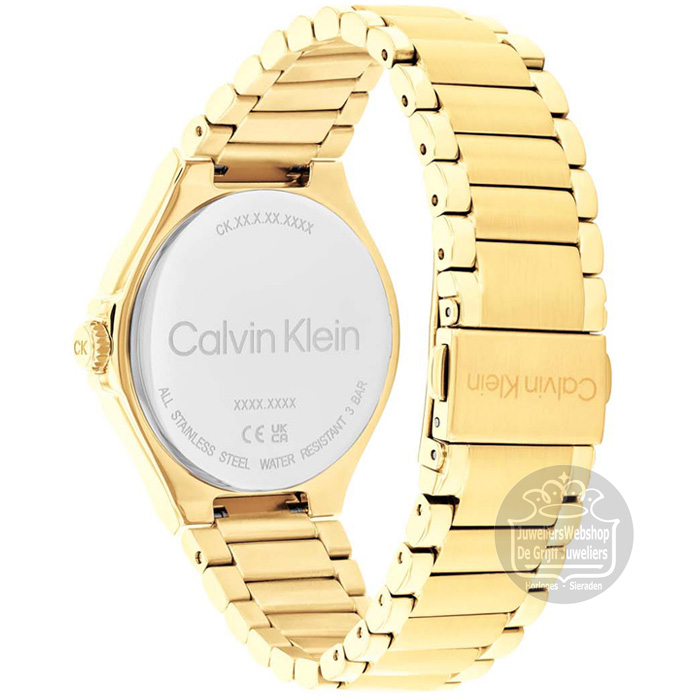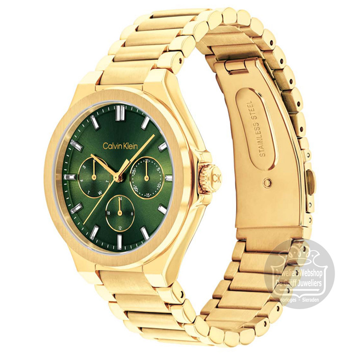 Het CK CK25100053 horloge heeft een goudkleurige edelstalen kast en een groene wijzerplaat voorzien van de naam Calvin Klein en goudkleurige wijzers. De doorsnede van de horlogekast is ca. 38 mm.
