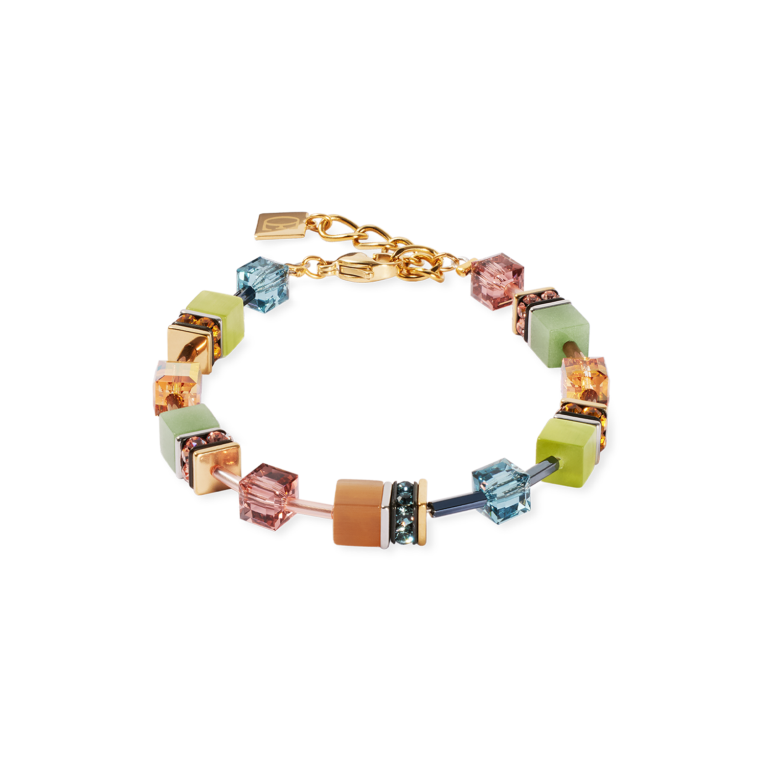 De Coeur de Lion 2838/30-0905 GeoCube armband is gemaakt van goudkleurige edelstalen elementen in combinatie met synthetische tijgeroog, swarovski kristallen en polaris in verschillende tinten groen en bruin. Als schitterend detail zijn een aantal kubussen bezet met swarovski kristallen.