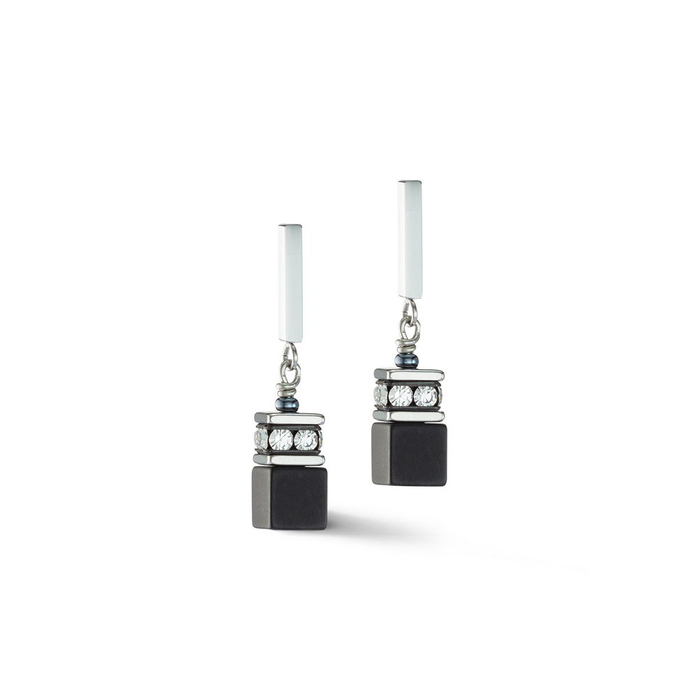 De Coeur de Lion 4018/21-1318 Oorbellen zijn gemaakt van zilverkleurige edelstalen elementen in combinatie met synthetische gekleurde tijgeroog, polaris en swarovski in verschillende tinten zwart. Als verfijnd detail is een kleine kubus met swarovski kristallen toegevoegd.