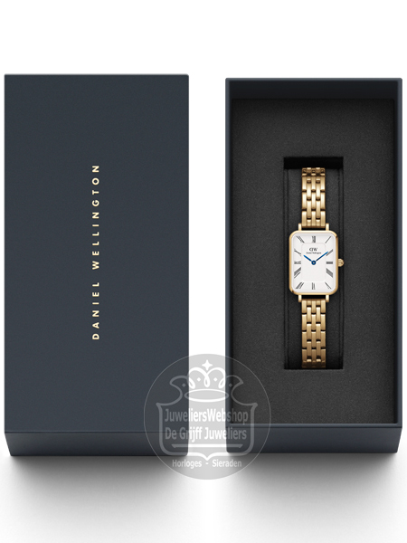Het Daniel Wellington Quadro Roman Numerals 20x26mm DW00100688 Dameshorloge heeft door de goudkleurige schakelband en rechthoekige goudkleurige kast een elegante uitstraling. Het ultra dunne (6mm) Daniel Wellington horloge is geschikt voor elke gelegenheid. De Quadro met witte wijzerplaat met romeinse cijfers, eigentijds tintje en frisse look, is nu al een designklassieker. Het is een stijlvol horloge dat zowel modern als tijdloos is. Het Quadro Roman Numerals horloge heeft een quartz uurwerk, mineraal glas en is 3 ATM waterbestendig. Met dit Daniel Wellington Quadro horloge straal je zelfvertrouwen uit.