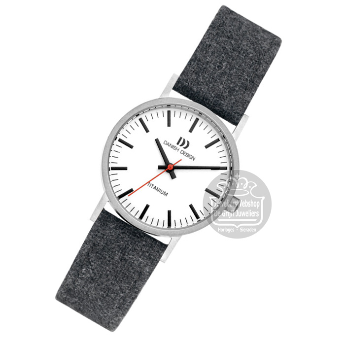 Het Danish Design IV40Q199 is een trendy dameshorloge naar het model van een Stationsklok. Het horloge heeft een Titanium kast en een grijze vegan band. Het IV40Q199 Danish Design horloge voor dames heeft een witte wijzerplaat voorzien van een uren/ minuten/ seconde en datum aanduiding, gehard mineraal glas en is 3 atm waterdicht.