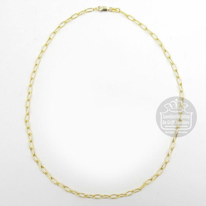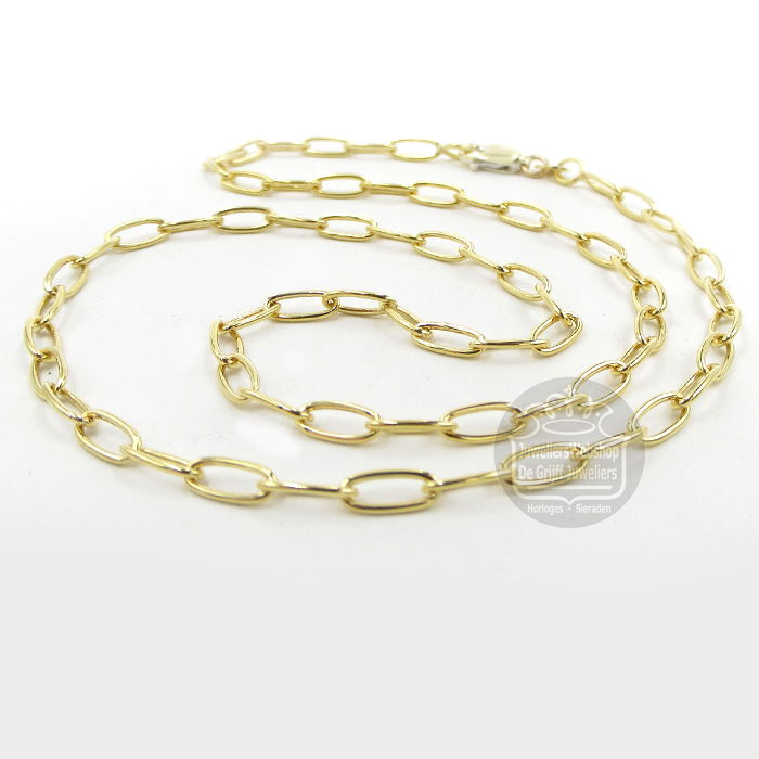 Dit Anker collier met ovale schakels van Fjory is uitgevoerd in 14 karaat geelgoud. Deze klassieke schakel heeft een speelse uitstraling. De schakel is 3,5 mm breed en het collier is 45 cm lang. Maak je look compleet met de bijpassende armbanden van Fjory.