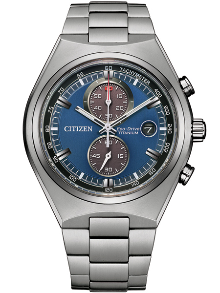 Citizen CA4610-85L herenhorloge. Een stoer en sportief horloge met een kast en band van TI+IP Super Titanium en een blauwe wijzerplaat.
