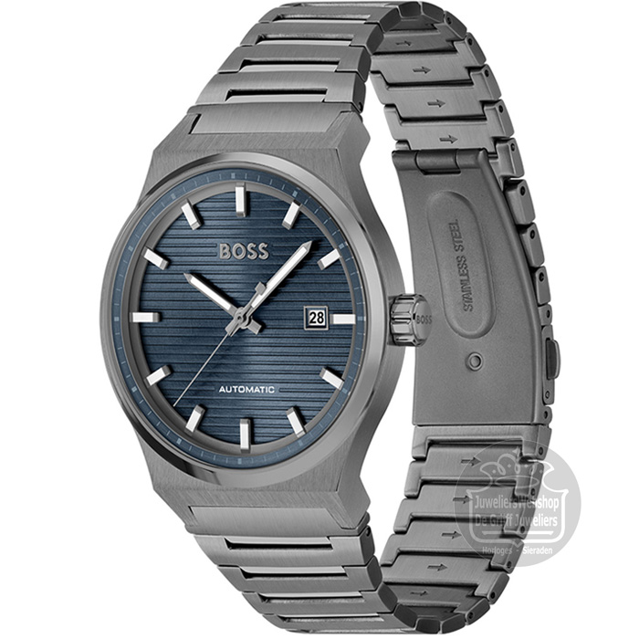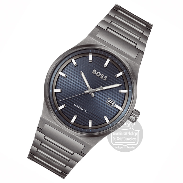 Het Hugo Boss Candor horloge is een sportief en robuust heren horloge. Het horloge heeft een donkergrijze edelstalen horlogekast en schakelband en is uitgerust met een automatisch uurwerk, energie uit beweging. Het horloge heeft een blauwe wijzerplaat met grijze accenten. Het Hugo Boss horloge heeft mineraal glas, is waterdicht tot 5 atm en wordt geleverd met een originele Hugo Boss watch box.