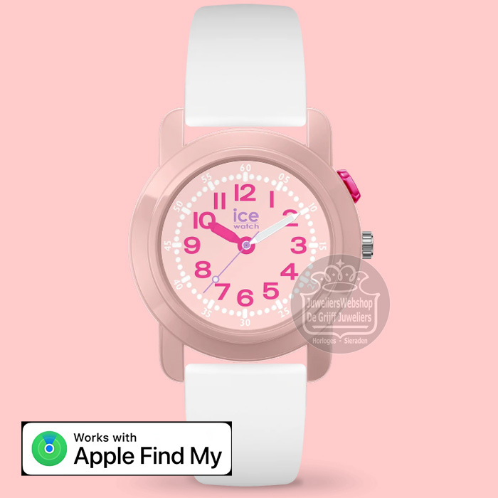 Ontdek de ICE find White pink, zacht en sprankelend. Het eerste kwartshorloge dat leren en veiligheid combineert. Het combineert een poederroze kast met een zacht, helder wit bandje: een horloge dat even schattig als slim is. Dankzij de geïntegreerde Find My-technologie van Apple is het gemakkelijker dan ooit om je horloge terug te vinden als je het verliest of vergeet. Een ideale metgezel voor energieke kinderen… en geruststellende ouders en grootouders!