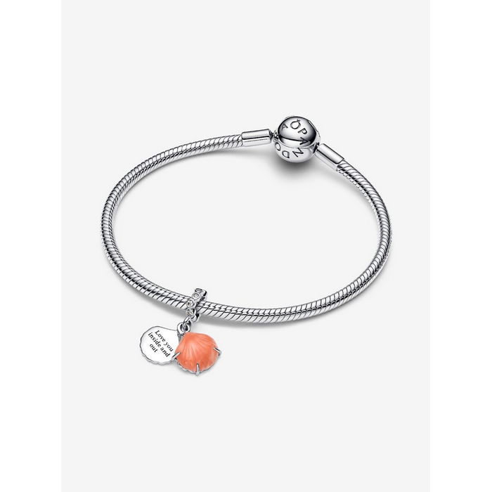 Pandora Hangende Bedel Koraalkleurige Schelp charm 793821C01 925 Sterling SilverVier de schatten van de zee met een betoverende dubbele hangende bedel met een schelpmotief en een schattige gegraveerde boodschap ‘Love you inside and out’.