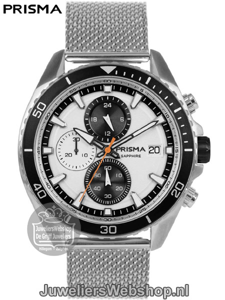het Prisma P.1325 Master herenhorloge is een prachtig chronograaf horloge met zwarte details en sportieve accenten. Het sportieve Master horloge heeft een edelstalen kast, een edelstalen Milanese (mesh) band en een witte wijzerplaat met zwarte accenten en een opvallende oranje secondewijzer. Het horloge heeft een dag, datum en een 24uurs aanduiding en een stopwatch functie, saffier glas en is tot 10 ATM waterdicht (zwemmen).
