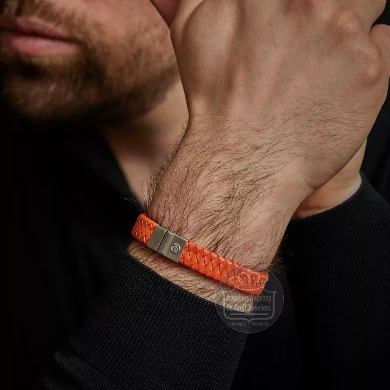 Rebel and Rose Full Metal Premium Orange RR-M0051-S-L gevlochten leren Armband 19cm