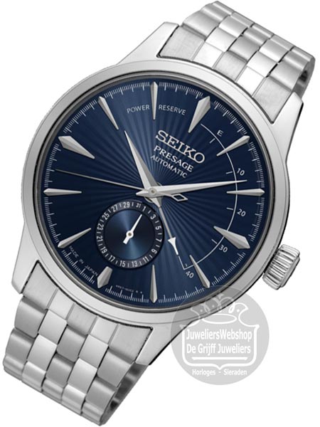 Het Seiko Presage SSA347J1 horloge is een horloge met een klassieke look. Het Seiko Presage horloge is uitgerust met een automatisch kwaliteitsuurwerk, energie uit beweging, waardoor een batterij niet nodig is. Tevens kan het automatische uurwerk met de hand worden opgewonden (mechanisch). Het Seiko Presage horloge heeft een edelstalen horloge kast en band, een donkerblauwe wijzerplaat met zilverkleurige accenten. Het automatische uurwerk is zichtbaar door de geschroefde achterdeksel met hardlex mineraalglas. Het Seiko Presage SSA347J1 herenhorloge heeft een datum functie, gehard mineraalglas en is 5 atm waterdicht.