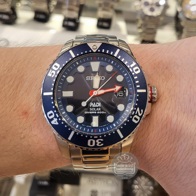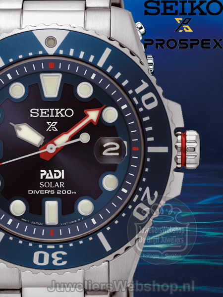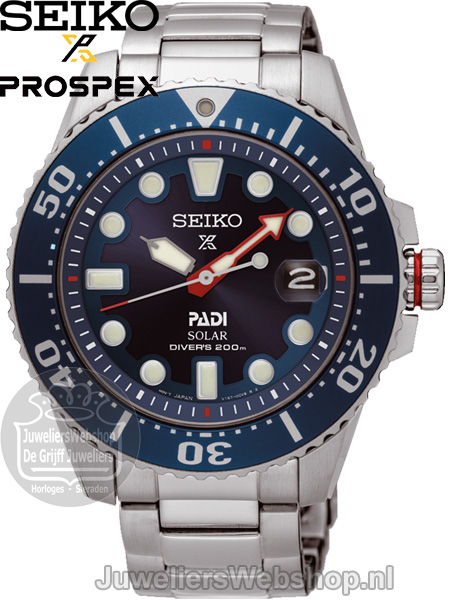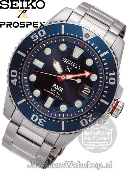 Het Seiko Prospex Padi Duikershorloge is een horloge dat uitermate geschikt is voor de duiksport. Het Seiko duikhorloge is uitgerust met een solar uurwerk (energie uit diverse soorten licht), waardoor een batterijwissel niet nodig is. Volledig opgeladen is de energiereserve tien maanden. Mocht er energietekort dreigen, geeft het horloge een extra waarschuwing door de secondewijzer in stappen van 2 seconden te laten lopen in plaats van per 1 seconde. Het Seiko Prospex SNE549P1 horloge heeft een edelstalen horloge kast met een blauwe draaibare lunette, een blauwe wijzerplaat met witte en rode accenten, een edelstalen band en een geschroefde achterdeksel. Het Seiko SNE549P1 duikershorloge heeft gehard mineraal glas en is 20 atm waterdicht.