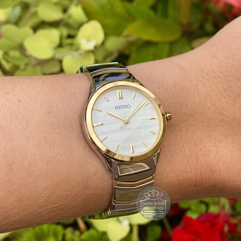 Het Seiko SUR550P1 Dameshorloge heeft een bicolor edelstalen kast en band en een lichte wijzerplaat. Dit rustige model heeft met zijn eenvoudige wijzerplaat en glanzende band een elegante uitstraling.