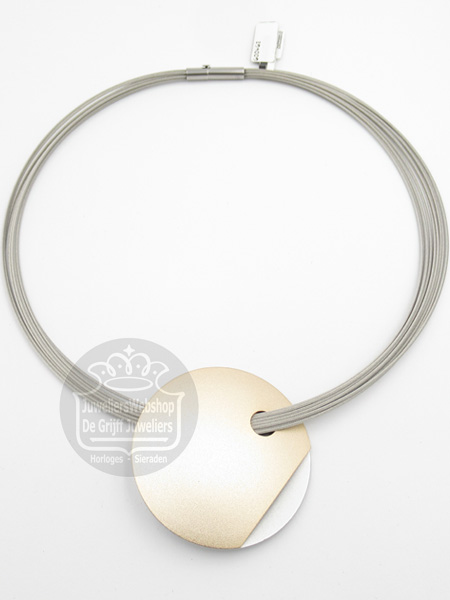 Step by Step 600463 collier bestaande uit staaldraden met een Geel verguld- en Grijskleurige ronde hanger. De strak vormgegeven hanger is vervaardigd uit Geel verguld en Grijs geanodiseerd aluminium en mat afgewerkt. Deze ketting van Step by Step is een eyecatcher om de hals.