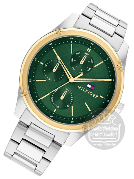 Het Tommy Hilfiger Tyler horloge is een sportief en trendy heren horloge. Het horloge heeft een edelstalen horlogekast en schakel band. Het horloge heeft een groene wijzerplaat met goudkleurige accenten, een dag-, datum- en 24uurs aanduiding. Het Tommy Hilfiger horloge heeft mineraal glas, is waterdicht tot 5 atm en wordt geleverd met een originele Tommy Hilfiger watch box.
