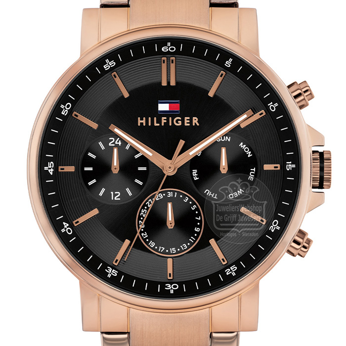 Het Tommy Hilfiger Tyson horloge is een sportief en trendy heren horloge. Het horloge heeft een rosékleurige edelstalen horlogekast en schakelband. Het horloge heeft een zwarte wijzerplaat met rosékleurige accenten en een datum-, dag-, en 24-uursaanduiding. Het Tommy Hilfiger horloge heeft mineraal glas, is waterdicht tot 5 atm en wordt geleverd met een originele Tommy Hilfiger watch box.