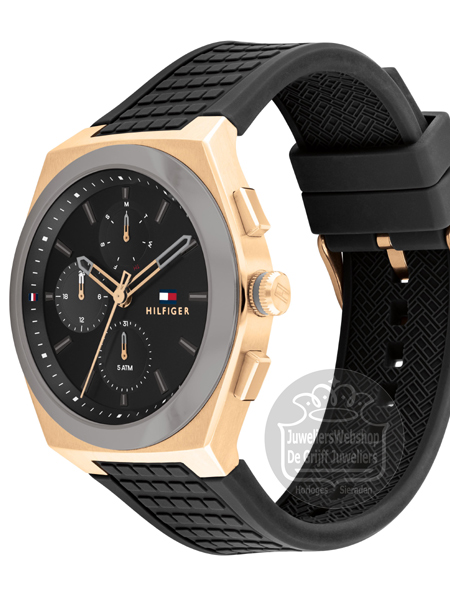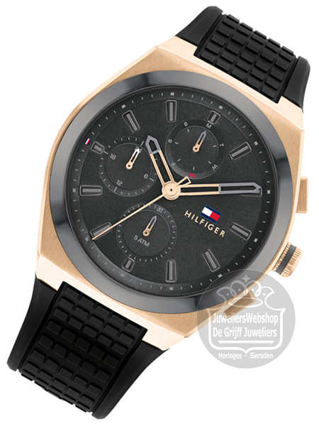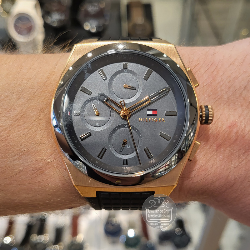 Het Tommy Hilfiger Connor horloge is een sportief en trendy heren horloge. Het horloge heeft een rosekleurige edelstalen horlogekast van ca. 44 mm en een rubberen band. Het horloge heeft een grijze wijzerplaat met rosekleurige accenten, een dag-, datum- en 24uurs aanduiding. Het Tommy Hilfiger horloge heeft mineraal glas, is waterdicht tot 5 atm en wordt geleverd met een originele Tommy Hilfiger watch box.