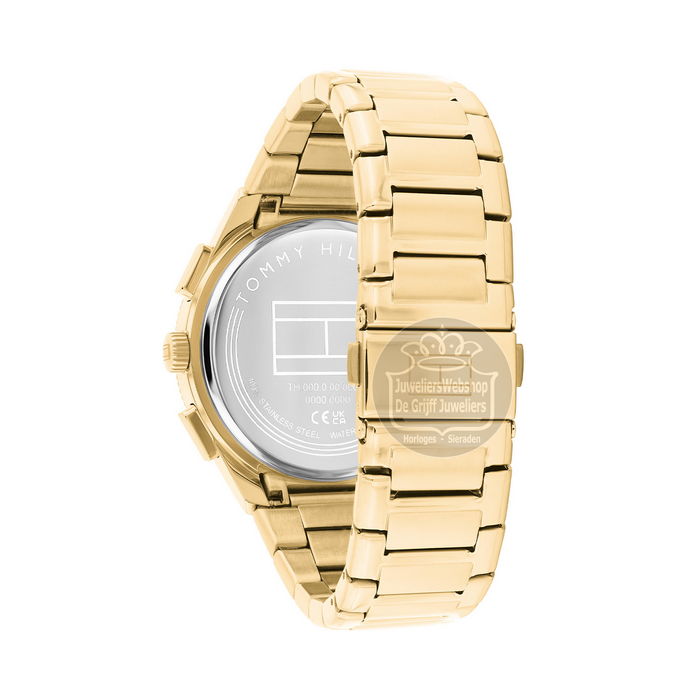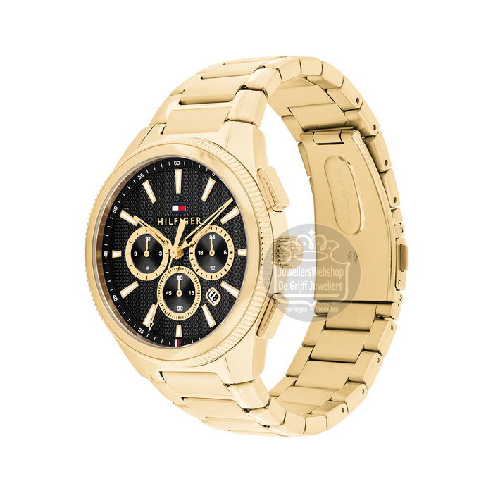 Het Tommy Hilfiger Hudson horloge is een sportief en stijlvol heren horloge. Het horloge heeft een goudkleurige edelstalen horlogekast met gekartelde lunette en een goudkleurige edelstalen band. Het horloge heeft een zwarte wijzerplaat met goudkleurige accenten, een stopwatchfunctie, datum- en 24uurs aanduiding. Het Tommy Hilfiger horloge heeft mineraal glas, is waterdicht tot 5 atm en wordt geleverd met een originele Tommy Hilfiger watch box.