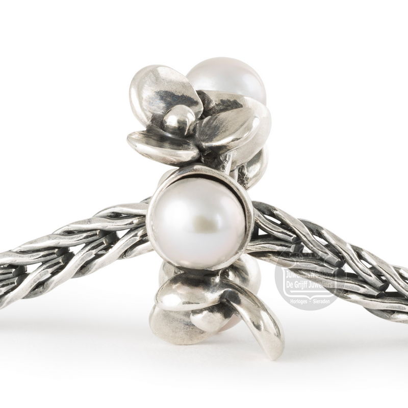 De bedel is gemaakt van 925 sterling zilver en parels. Deze zilveren bedel past op Trollbeads armbanden en Trollbeads kettingen.