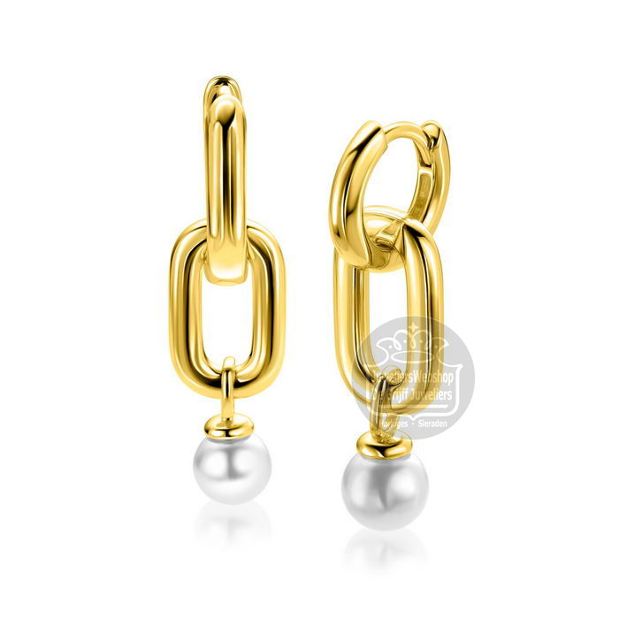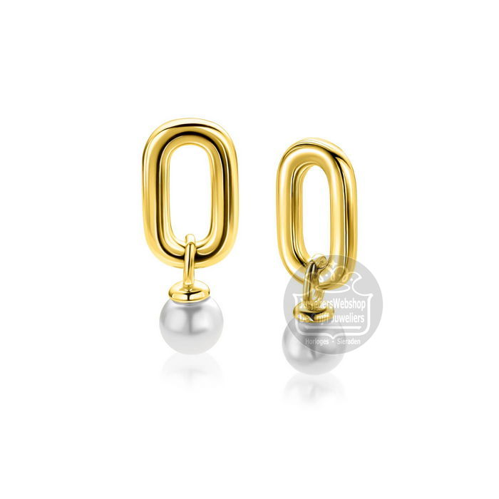 ZINZI goldplated zilveren oorbedels met een langwerpige stoere schakel (23mm) en een bungelende witte parel (6mm). De oorbedels zijn vervaardigd van eerste gehalte zilver (925) en extra geel verguld.