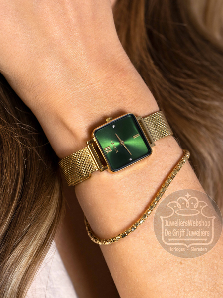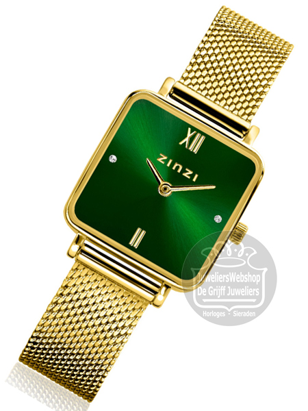 Het Zinzi Square Mini ZIW1735M dameshorloge heeft een goudkleurige edelstalen kast en band. De Milanese band is eenvoudig te wisselen door het handige schuifsysteem aan de achterkant. Het horloge heeft een groene wijzerplaat en een verfijnde kastmaat van 22mm. Het horloge heeft sterk mineraal glas en is 5 ATM waterdicht (regen- en spatwaterdicht).