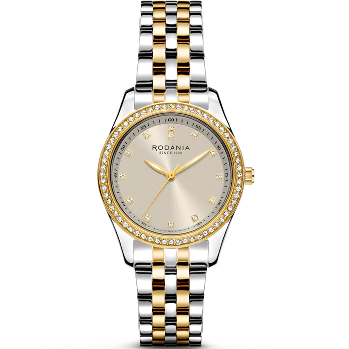 Het Rodania R11037 horloge uit de Gstaad collectie is een elegant model met klassieke uitstraling. Dit model heeft een slanke zilver met goudkleurige edelstalen kast en schakelband. De sunray wijzerplaat in een warme taupe kleur is afgewerkt met schitterende zirconia en chique goudkleurige details. Het krasvaste saffierglas zorgt voor helder zicht op de wijzerplaat.