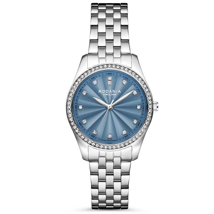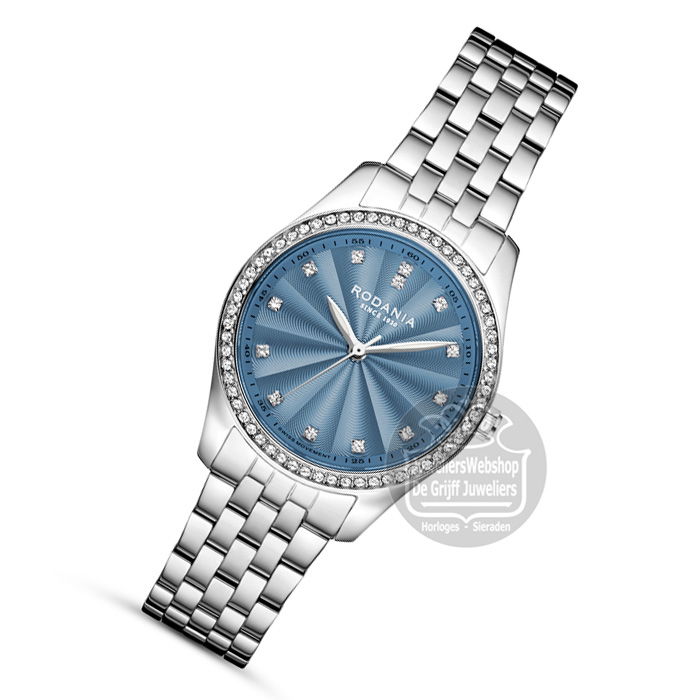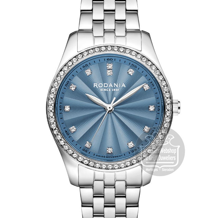 Het Rodania R11041 horloge uit de Gstaad collectie is een elegant model met klassieke uitstraling. Dit model heeft een slanke zilverkleurige edelstalen kast en zilverkleurige edelstalen schakelband. De prachtige subtiel bewerkte wijzerplaat in het blauw is afgewerkt met schitterende zirconia en chique zilverkleurige details. Het krasvaste saffierglas zorgt voor helder zicht op de wijzerplaat.