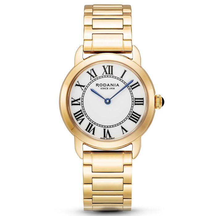 Het Rodania R27012 horloge uit de Lausanne collectie is een zeer tijdloos en chique model wat past bij elke outfit. Het R27012 horloge heeft een goudkleurige edelstalen kast en een goudkleurige edelstalen schakelband. De zwarte romeinse cijferaanduiding in combinatie met de blauwe wijzers maakt dit horloge een ware klassieker! Het krasvaste saffierglas zorgt voor helder zicht op de wijzerplaat.